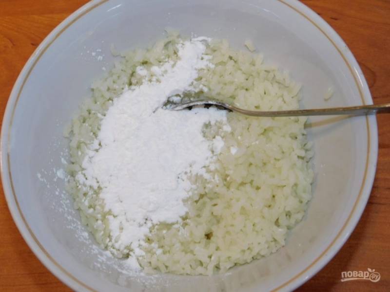 Рис отварите в большом количестве воды, так чтобы он немного разварился. Остудите, добавьте крахмал и хорошо перемешайте.