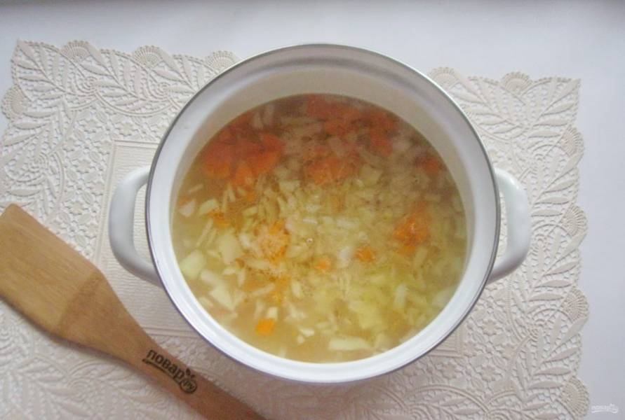 Морковь и репчатый лук очистите, помойте и мелко нарежьте. Выложите в сковороду с подсолнечным маслом. Немного поджарьте эти овощи в сковороде в течение 10 минут, перемешивая.