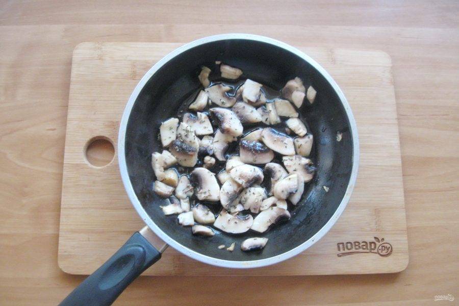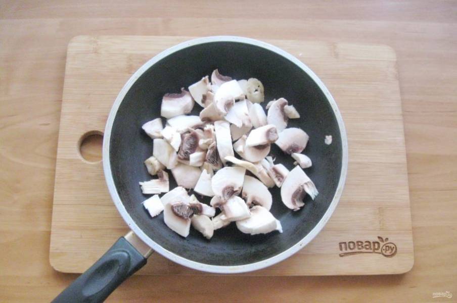 Шампиньоны помойте, очистите шляпки и нарежьте. Выложите в сковороду.