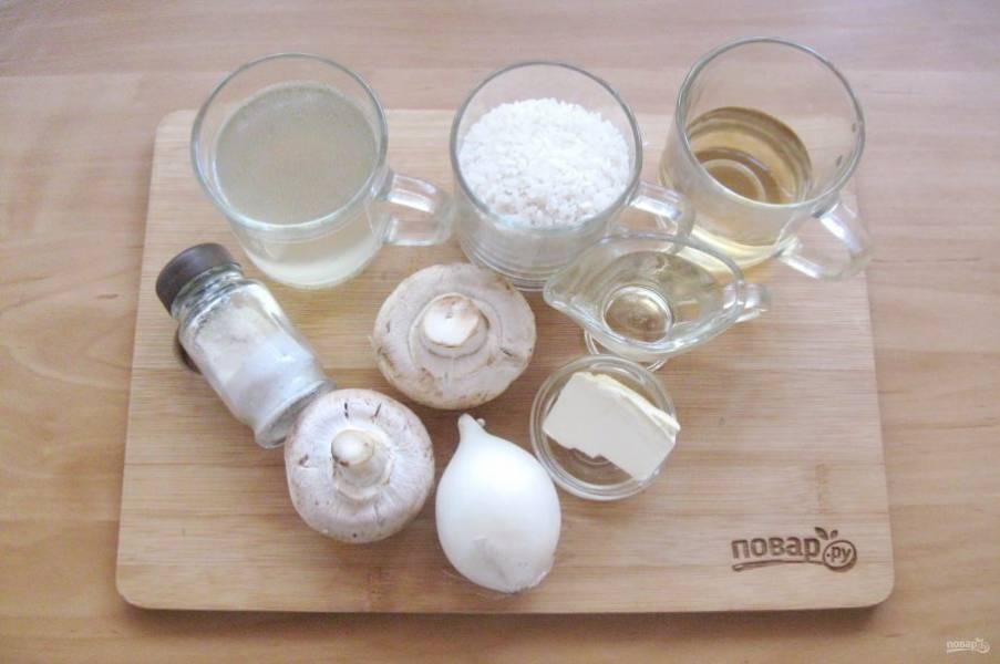 Подготовьте ингредиенты для приготовления ризотто по-итальянски.