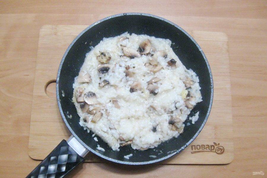 Влили половник бульона и выпаривайте его, перемешивая рис. Как только ризотто начнет густеть, сразу вливайте следующий половник. Так до тех пор, пока рис не станет мягким, кремовой консистенции.