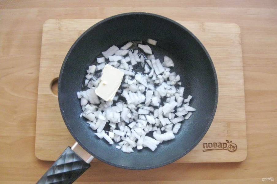 Репчатый белый лук очистите, помойте и мелко нарежьте. Выложите в сковороду с растительным и сливочным маслом.