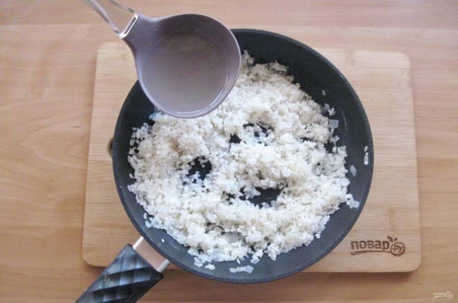 Добавьте к луку рис. На небольшом огне поджарьте рис в течение минуты перемешивая, чтобы рис покрылся маслом.
