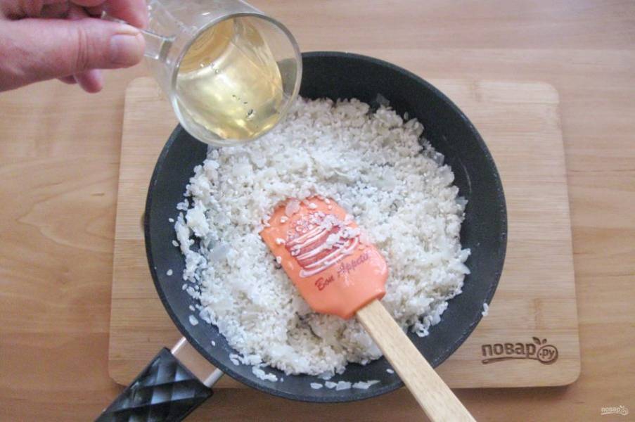После влейте сухое вино и перемешивая рис на среднем огне, дайте вину впитаться.