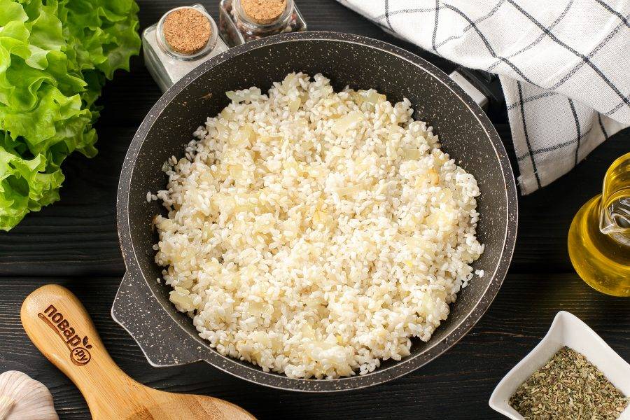 Затем добавьте рис для ризотто. Рис рекомендуется готовить в сухом виде. В течение пары минут рис должен пропитаться маслом и ароматами.