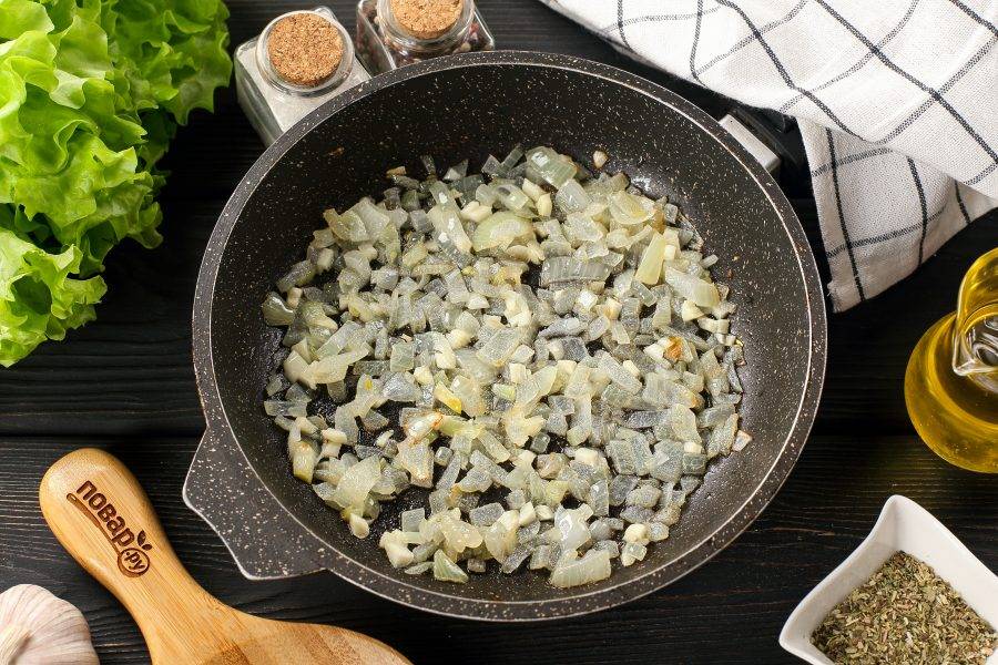 Лук мелко нашинкуйте, чеснок нарежьте кубиками или раздавите широкой стороной ножа. В глубокой сковороде нагрейте оливковое (или другое растительное) масло вместе с луком и чесноком. Установите слабый огонь и потомите овощи минут 5.