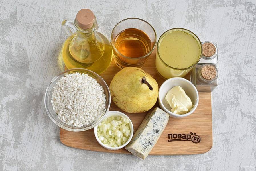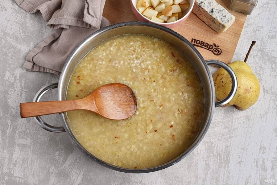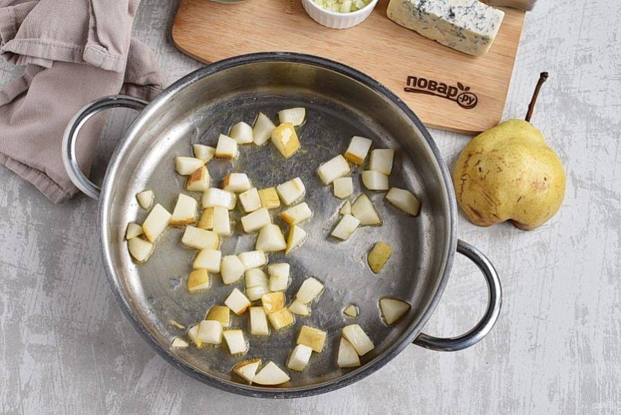 Для приготовления ризотто лучше взять удобный глубокий сотейник. Готовить нужно на огне чуть ниже среднего. Бульон должен быть кипящим. Удобно держать его на плите рядом с сотейником. Растопите сливочное масло и обжарьте половинку нарезанной кубиками груши до легкой карамелизации.