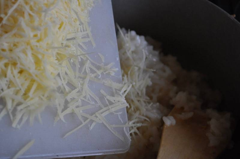 Теперь очередь куриного бульона. Но его надо вливать не весь сразу, а добавлять частями. Вливаем немного и ждем, пока рис впитает жидкость, затем вливаем еще и так до полной готовности риса.