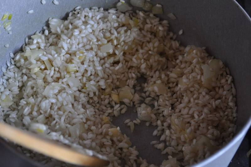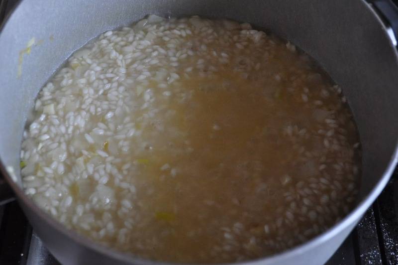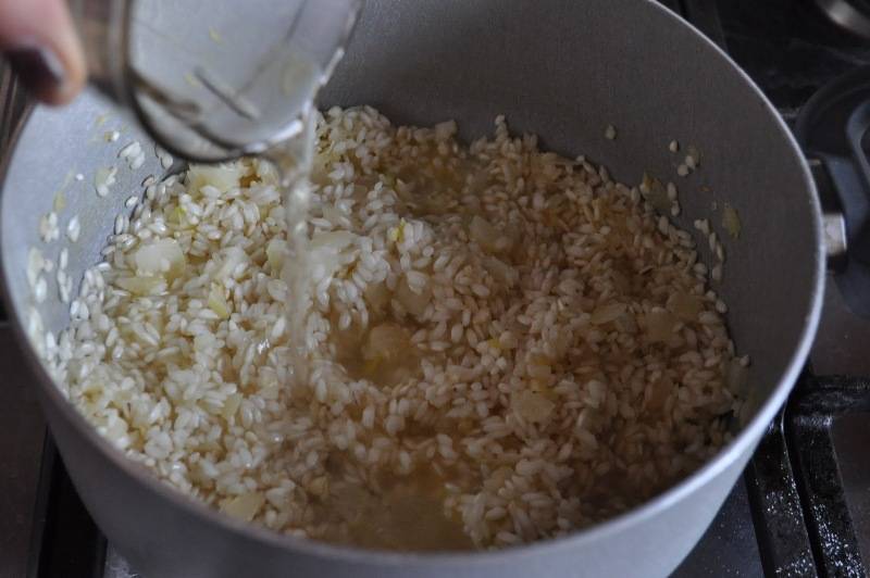 Далее нам необходимо добавить белое вино и посолить рис. Продолжаем жарить его, постоянно помешивая, пока влага не впитается.