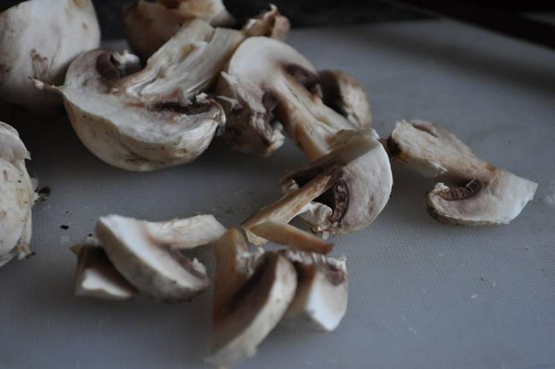 Тем временем мы нарезаем кубиками оставшийся лук и обжариваем его на сковороде с добавлением оливкового масла. Грибы так же режем пластинками и выкладываем жариться к луку.