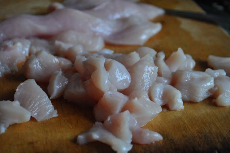 Куриное филе нарезаем брусками и, когда из грибов выпарится лишняя влага, выкладываем на сковороду курицу, солим и перчим, жарим все минут 20.