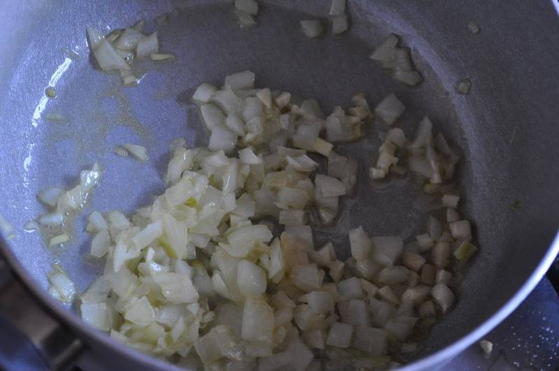В кастрюльку выкладываем примерно столовую ложку сливочного масла и обжариваем на нем лук и чеснок до золотистого цвета.