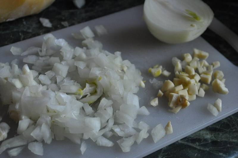 Лук и чеснок очищаем, половинку репчатого лука нарезаем небольшими кубиками, чеснок тоже измельчаем.