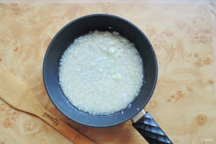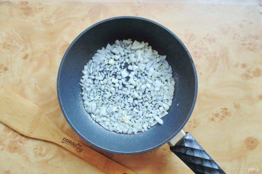 Налейте растительное масло и поджарьте лук до прозрачности. Сильно зажаривать не нужно.