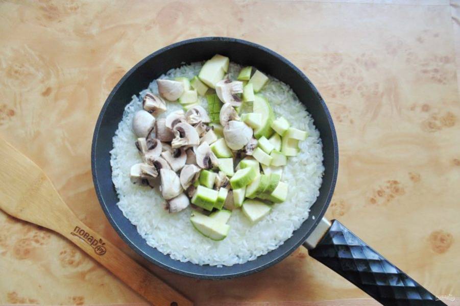 В середине варки риса добавьте нарезанные шампиньоны и кабачок. Посолите по вкусу.