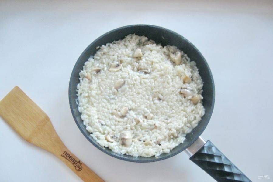 Влили половник бульона и выпариваем его, помешивая ризотто. Как только рис начнет густеть, снова наливайте половник бульона. И так до тех пор, пока рисинки не станут мягкими на вкус. Потребуется примерно 600-700 мл. бульона.