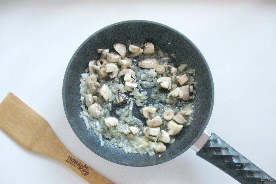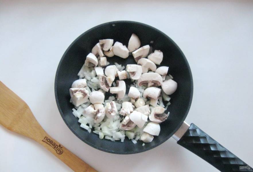 Шампиньоны очистите, помойте и нарежьте не очень мелко. Добавьте к луку в сковороду.