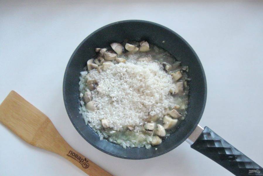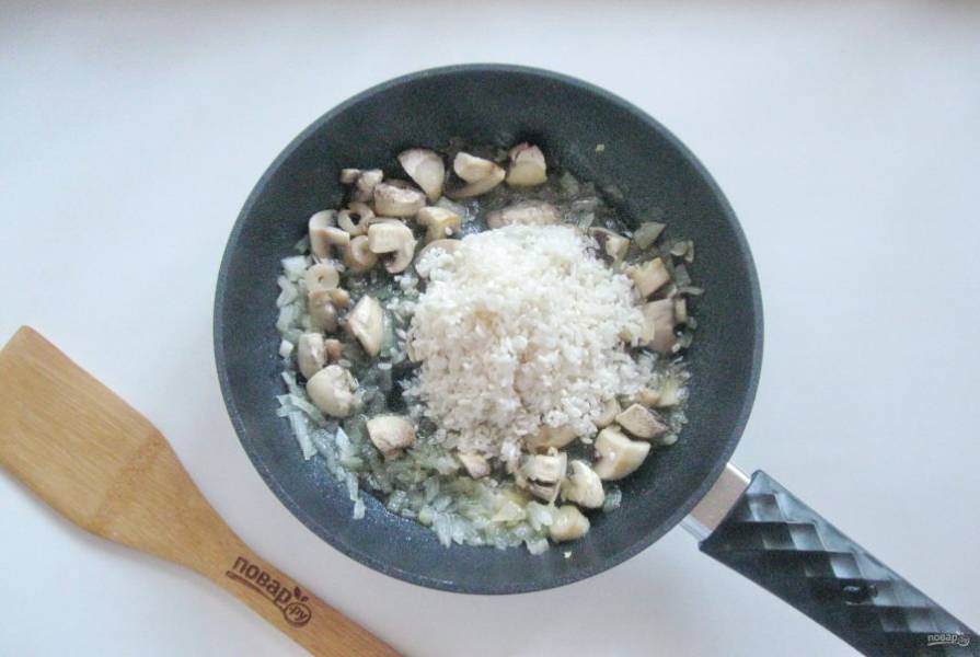 Всыпьте в сковороду рис, который предварительно помойте, стараясь сильно не вымывать крахмал. На слабом огне перемешивая, поджарьте рис в течение 1 минуты.