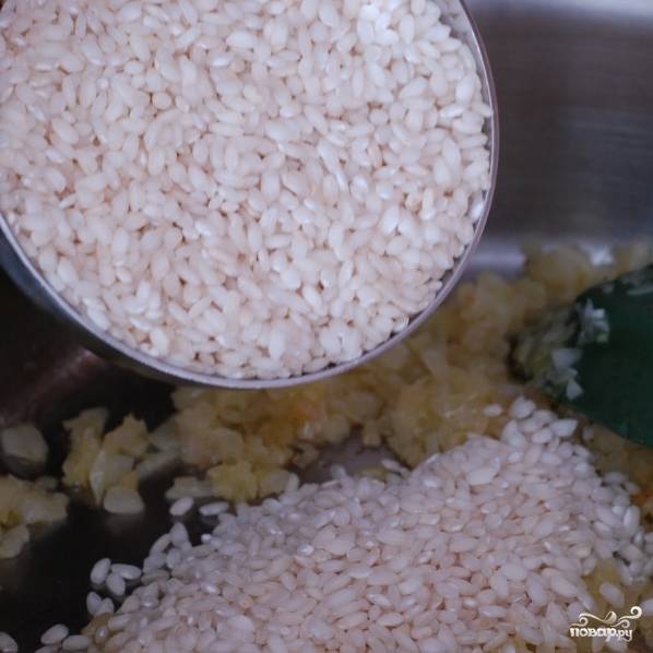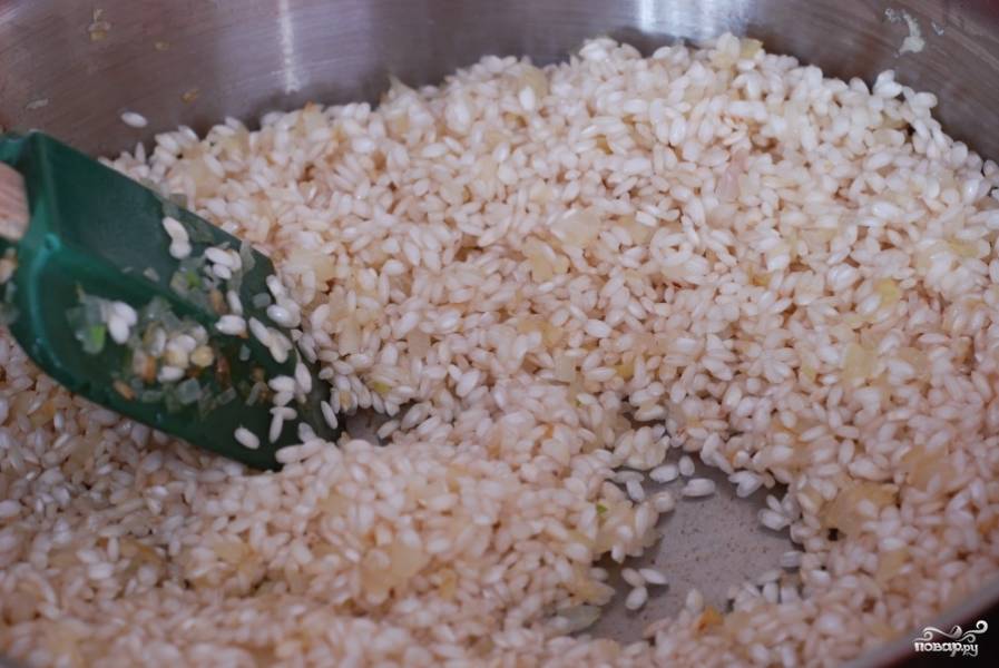 Обжариваем до прозрачности лука, после чего добавляем в жаровню рис.