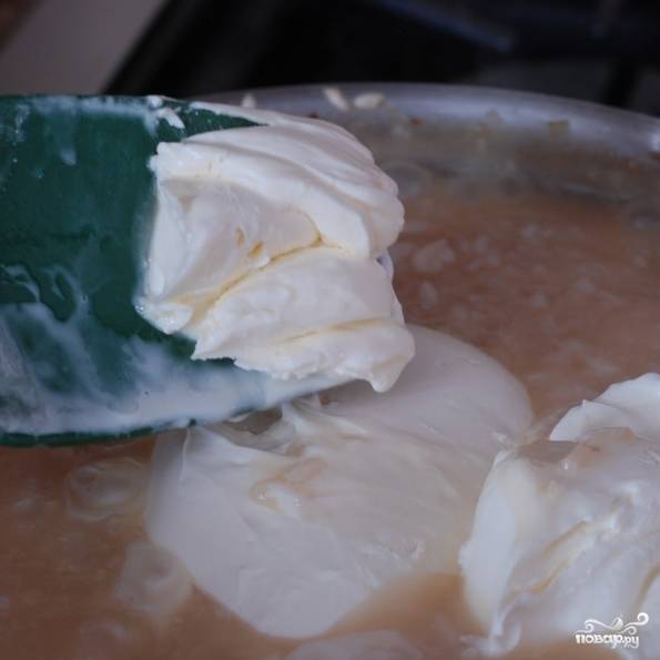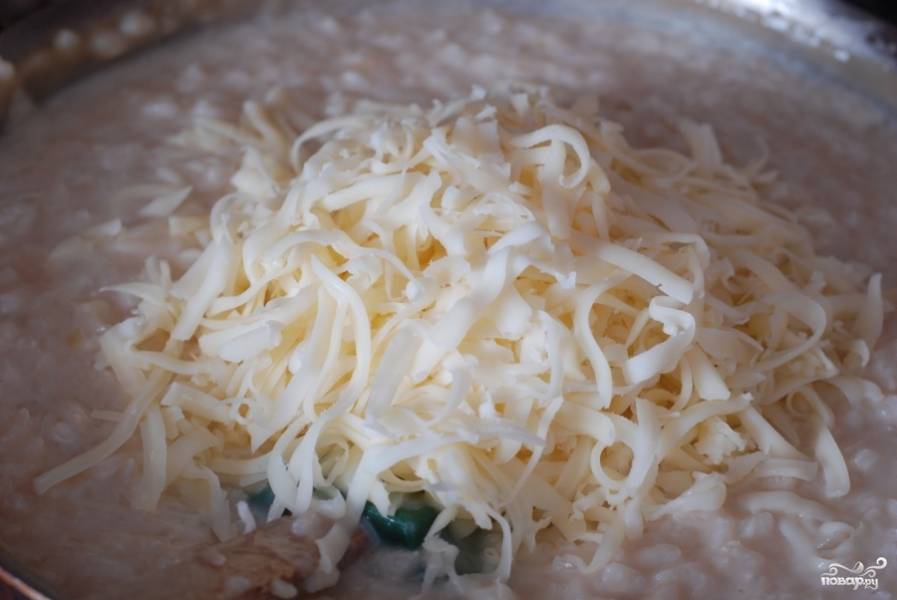 Когда рис будет готов, добавляем в жаровню сыр маскарпоне. Продолжаем готовить на среднем огне, перемешиваем - уже через 1-2 минуты маскарпоне растает.