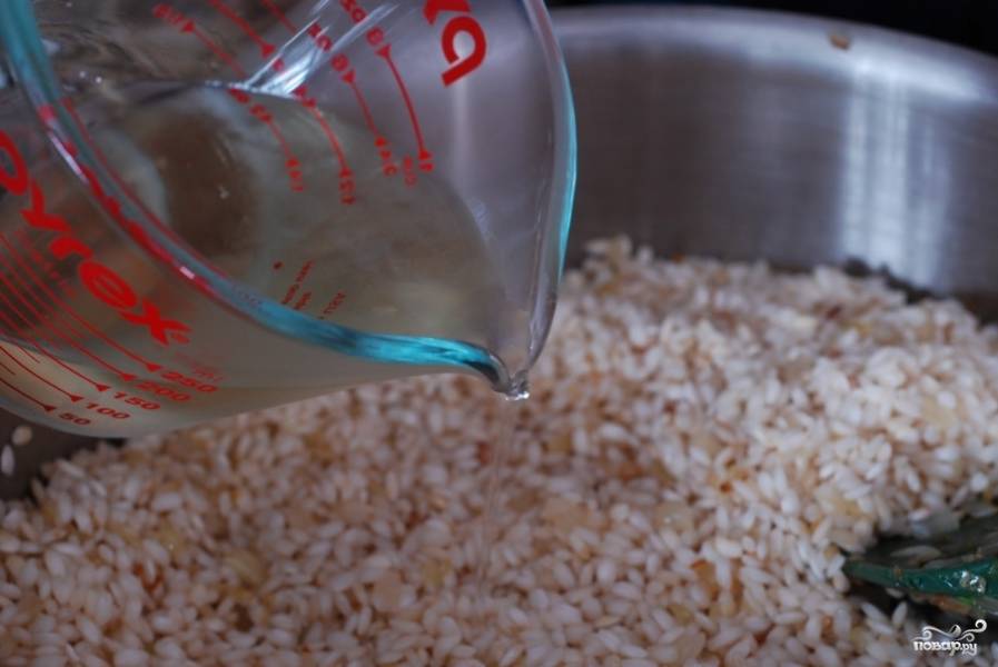 Когда вино испарится почти полностью, добавляем в жаровню половник бульона.