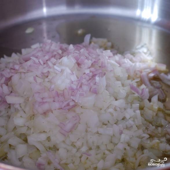 В жаровне разогреваем оливковое масло, бросаем в него мелко нарезанный лук (репчатый и шалот).