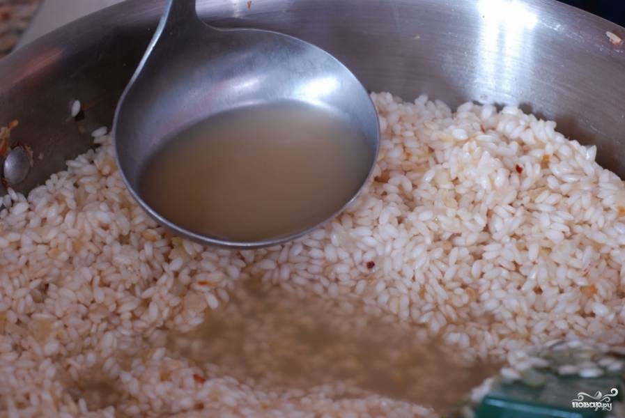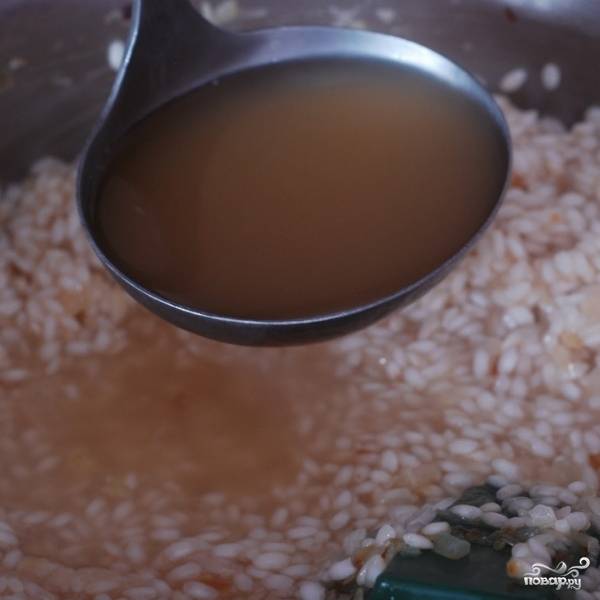 Повторяем процедуру до тех пор, пока рис не будет готов. Подливать бульон нужно по чуть-чуть, по половнику, если налить его весь сразу - ничего не получится. Готовность риса определяем дедовским методом - пробуем на вкус.