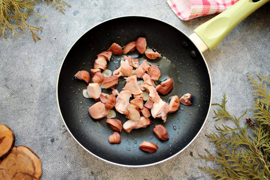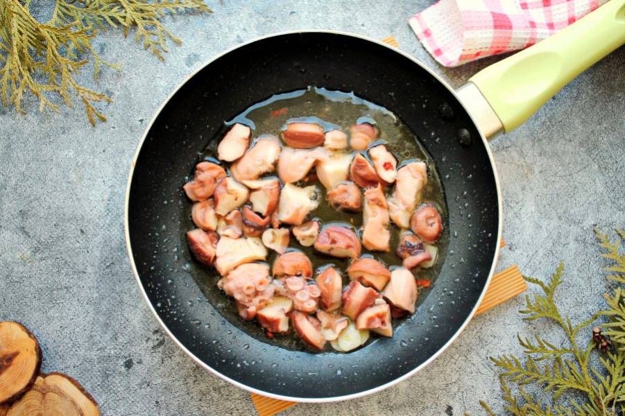 Готовый осьминог порежьте на кусочки и выложите в сковороду с чесноком и перцем, посолите. Обжаривайте все на среднем огне 3 минуты.