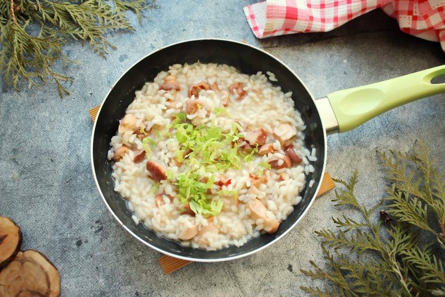 В готовое ризотто добавьте нарезанную зелень, перемешайте и сразу подавайте к столу.