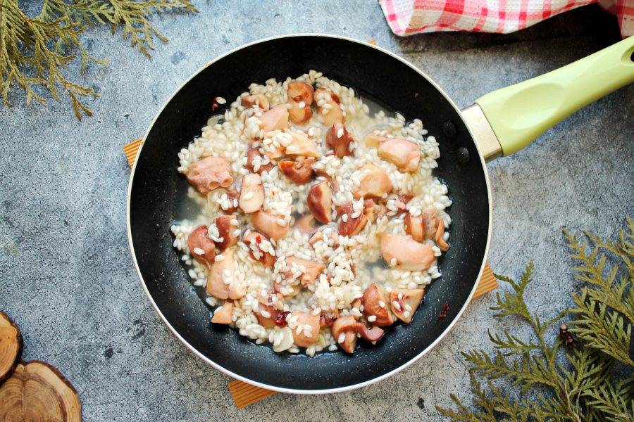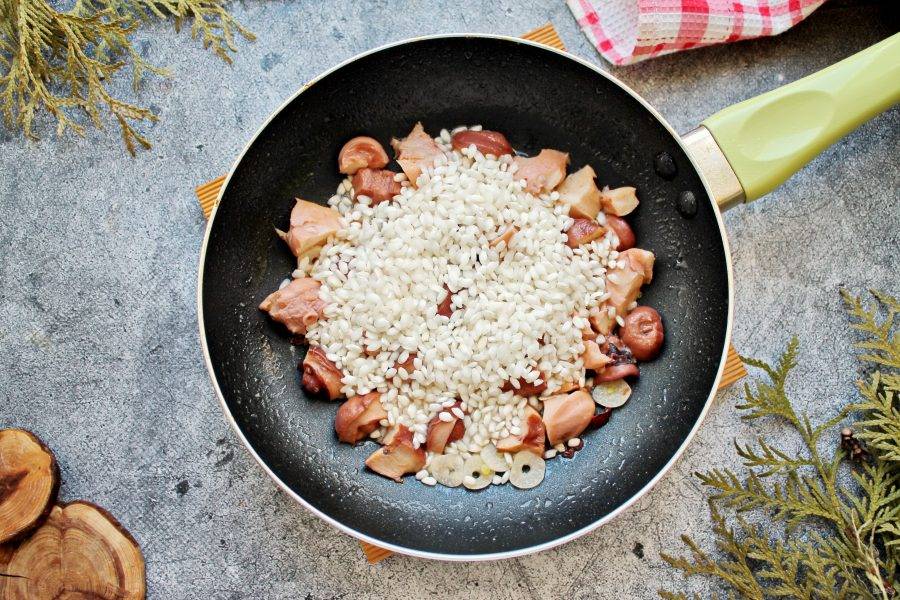Всыпьте в сковороду сухой рис для ризотто, готовьте перемешивая 2 минуты, чтобы рис впитал соки и масло.