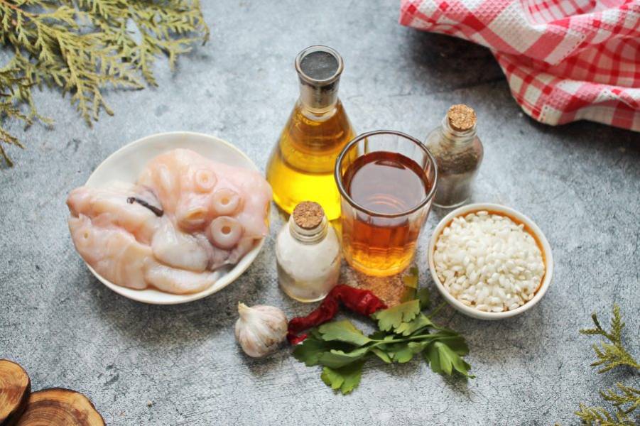 Подготовьте все необходимые ингредиенты для приготовления ризотто с осьминогом.