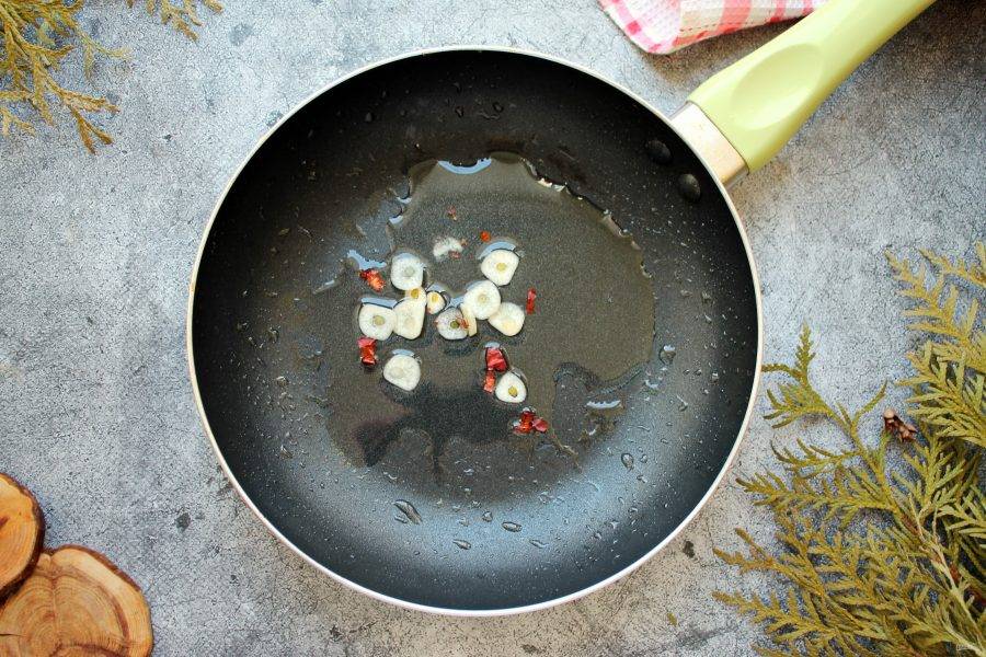 В кастрюлю с толстым дном налейте растительное масло и разогрейте на среднем огне. Добавьте в сковороду порезанный чеснок и острый перец. Обжаривайте все в течение 30 секунд.