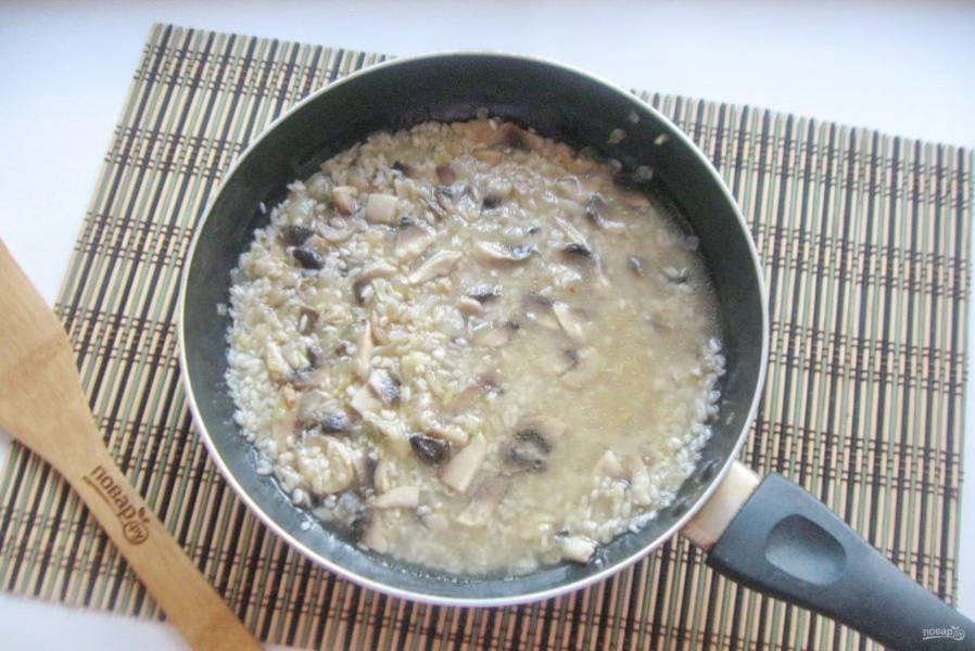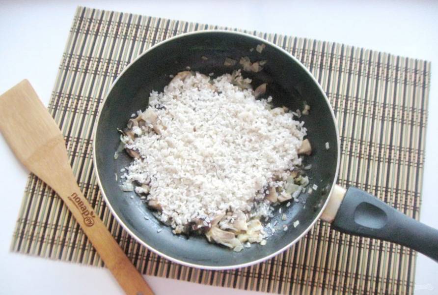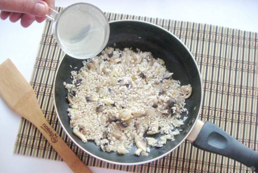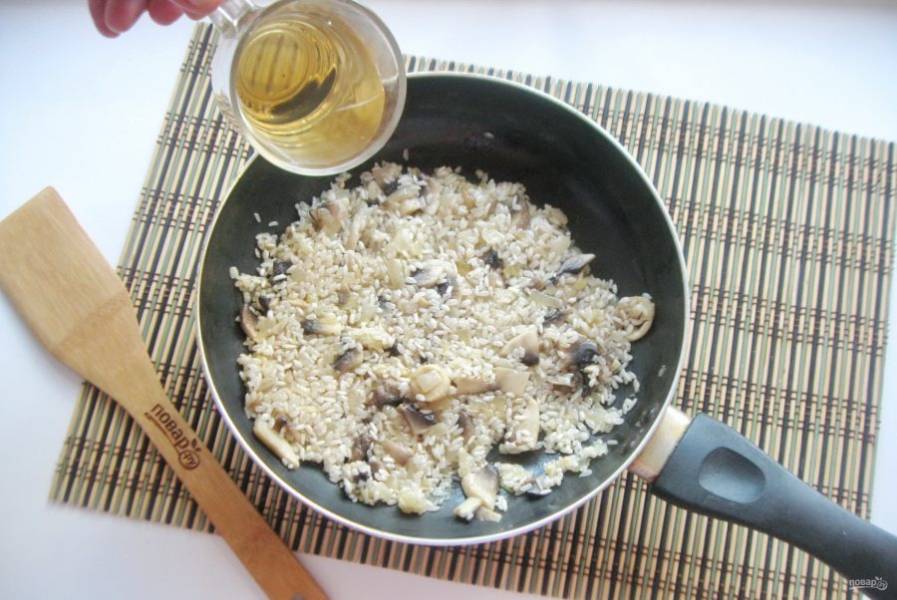 Поджаривайте рис с луком и грибами 3-4 минуты, перемешивая. После влейте вино.