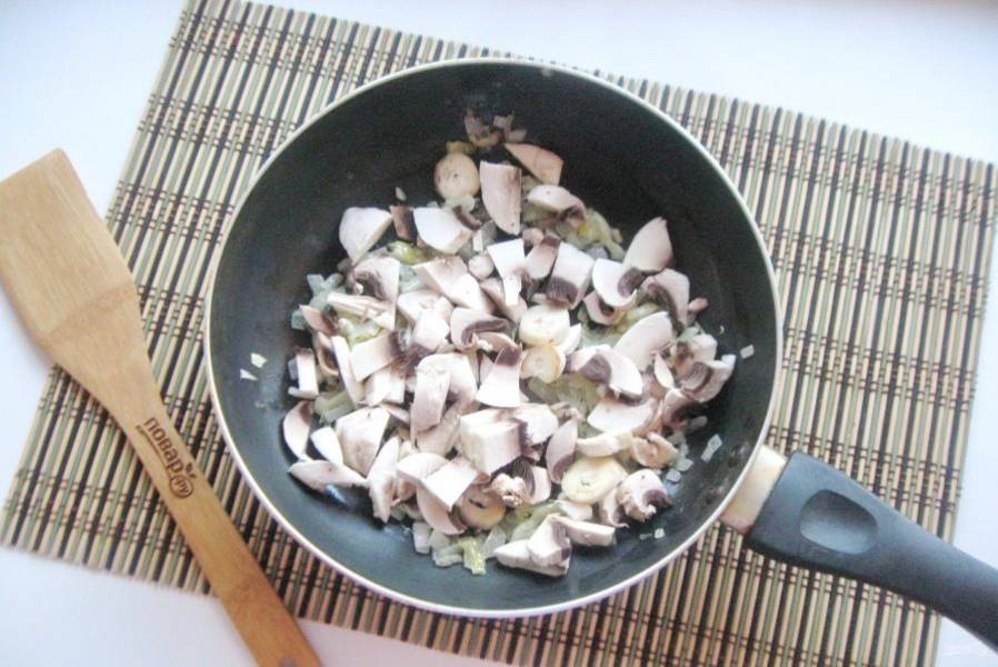Затем добавьте нарезанные шампиньоны.