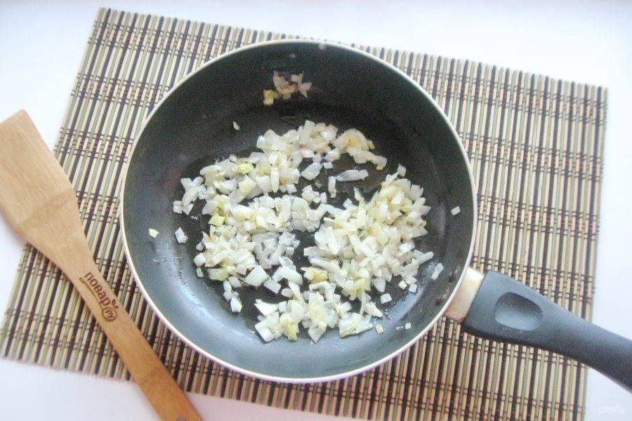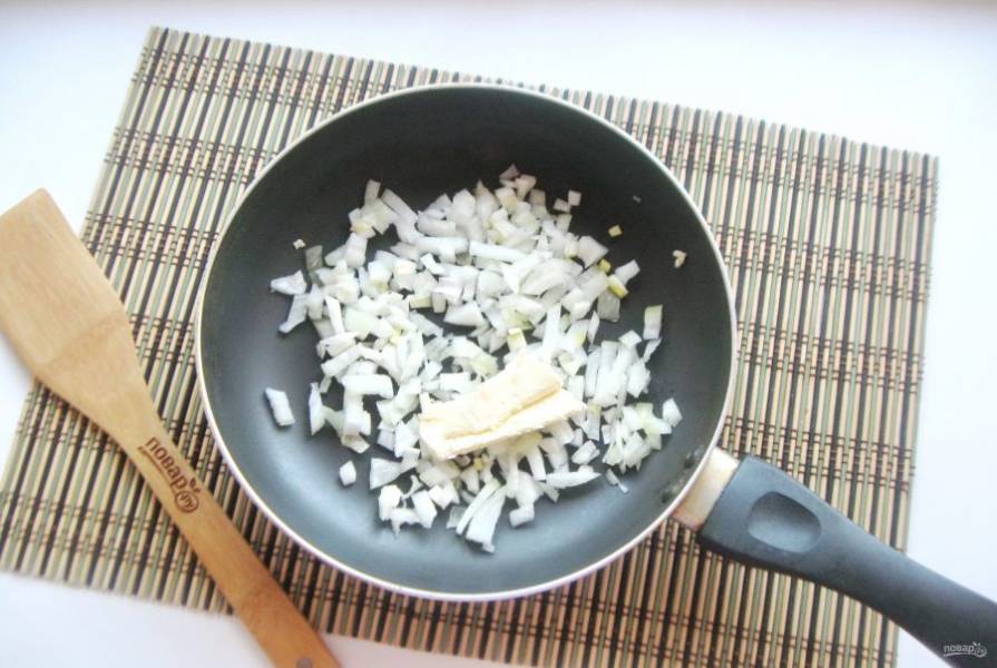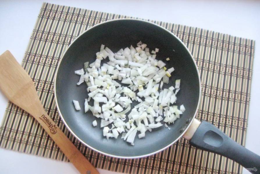 Репчатый лук очистите, помойте и мелко нарежьте. Выложите в сковороду или сотейник.