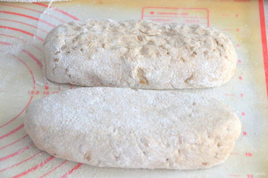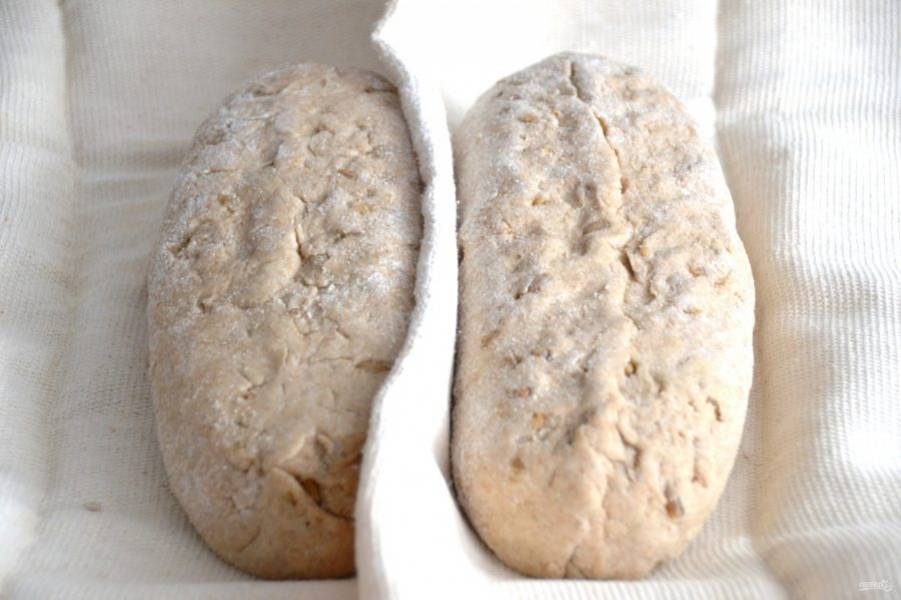 Выложите заготовки хлеба "швом вверх" на салфетку, в которую вбита мука. Накройте концами салфетки или пленкой, оставьте на расстойку на 2 часа.