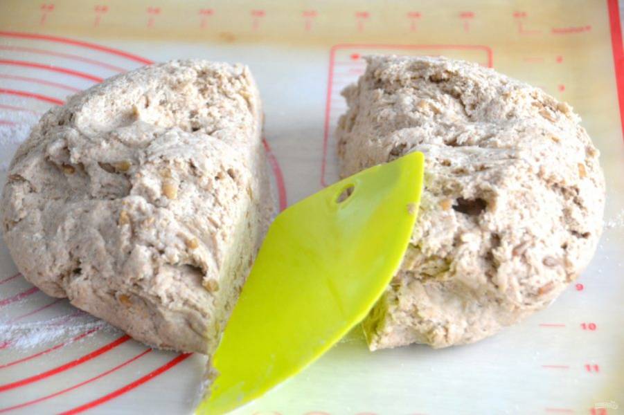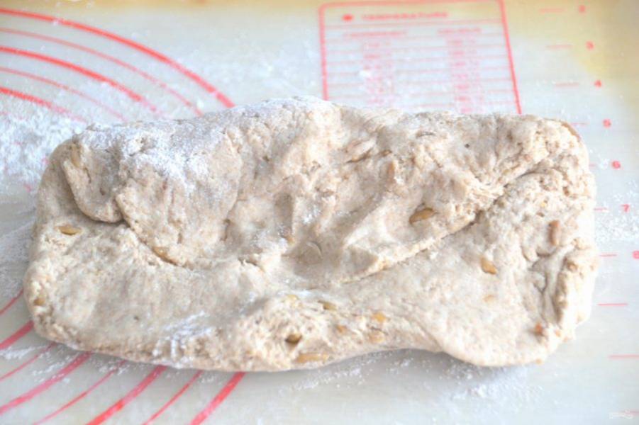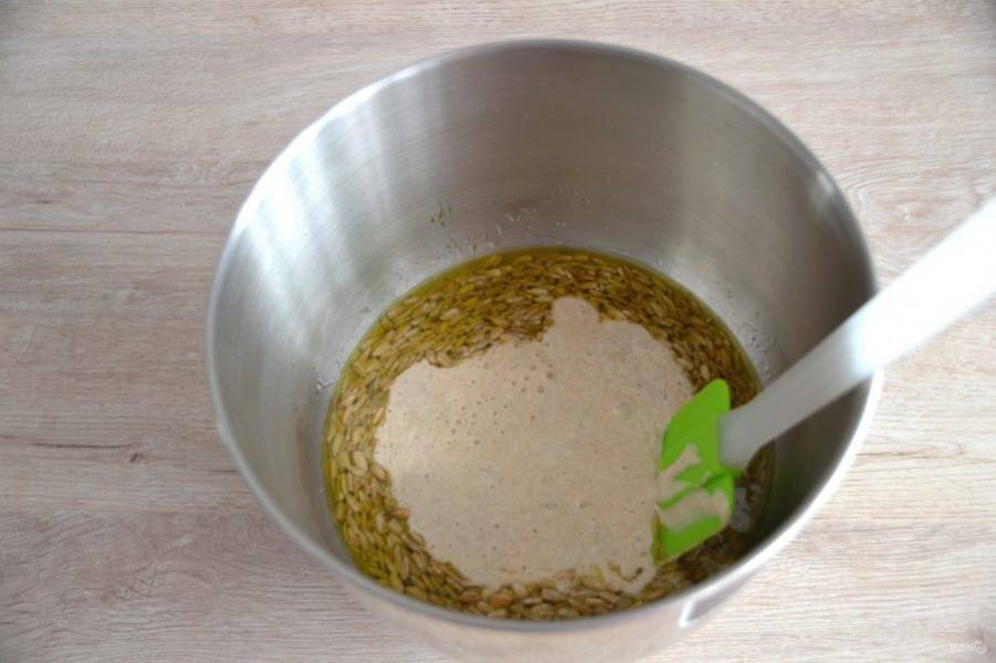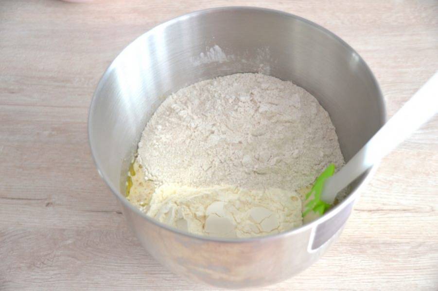 Всыпьте пшеничную и ржаную муку. Замесите тесто.