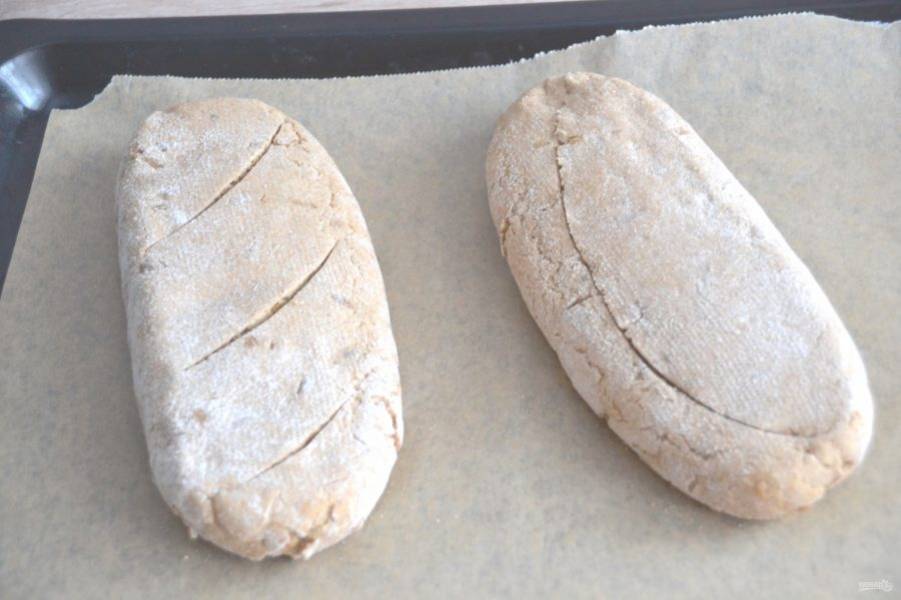 Через 2 часа переложите хлеб на лист для выпечки. Заранее включите духовку на разогрев до 250 градусов. Сделайте произвольные надрезы на хлебе.