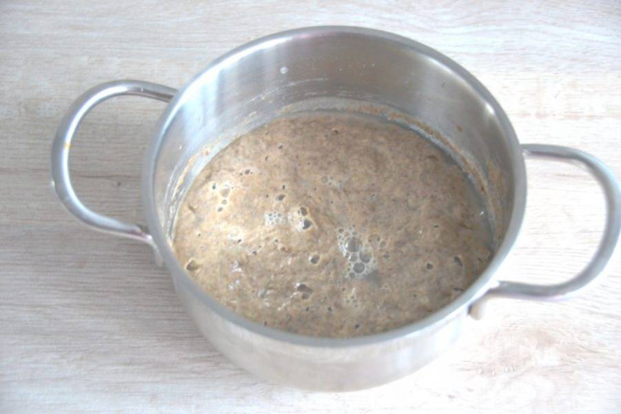 Через 1 час добавьте 50 грамм муки, смешайте, затяните пищевой пленкой, оставьте в теплом месте для брожения на сутки.