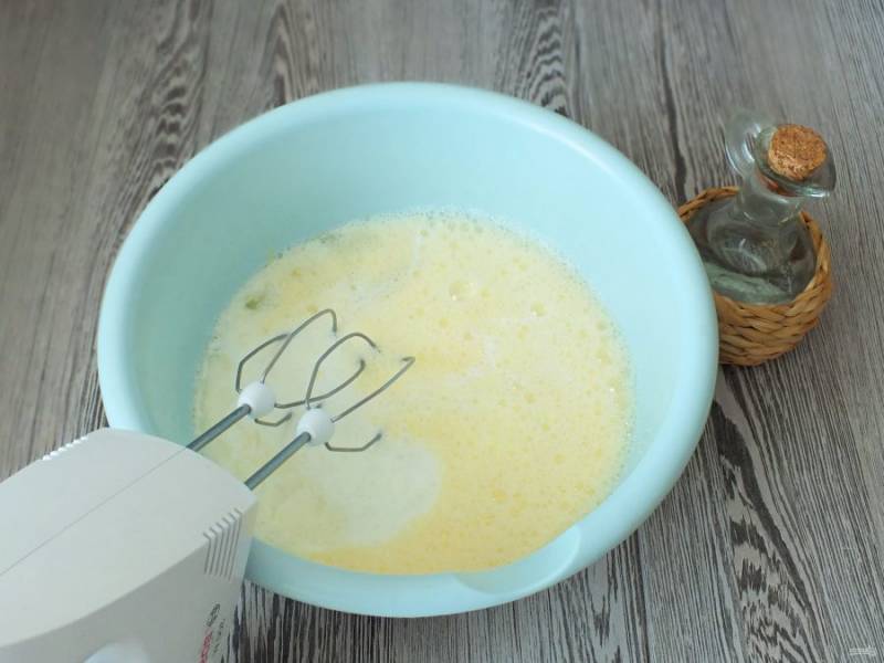 В яичную массу добавьте горячую воду, водку, растительное масло и взбейте миксером.