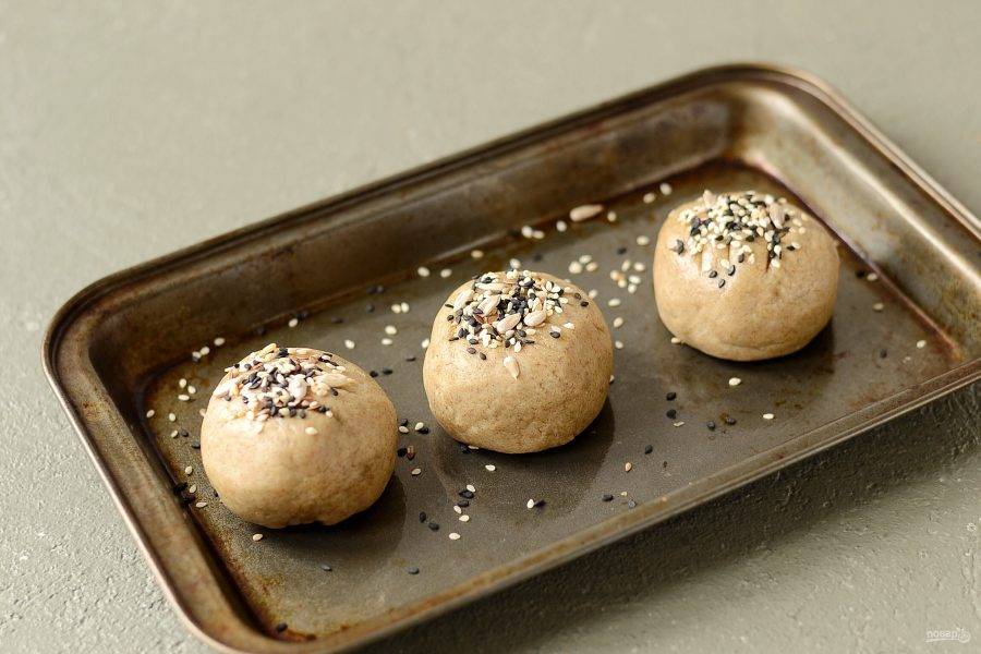 Сформируйте из теста булочки, посыпьте их кунжутом и льняными семечками. Выпекайте в духовке 25-30 минут при температуре 180 градусов.