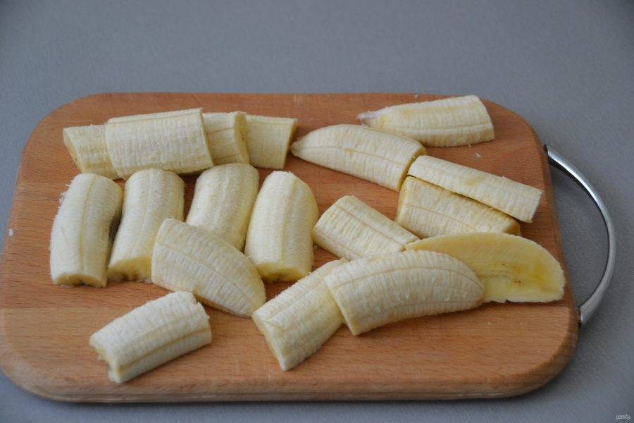 Бананы порежьте на 6 частей, каждый банан разрежьте вдоль и каждую половинку на 3 части.