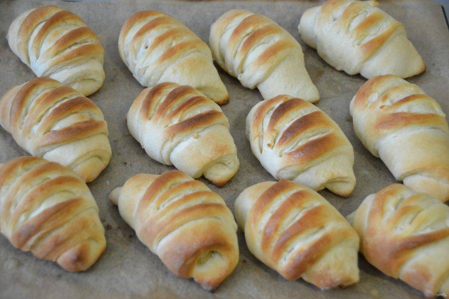 Выложите рогалики на лист для выпечки, дайте расстойку 20-30 минут. Перед выпечкой смажьте сливочным маслом, выпекайте 25-30 минут при температуре 180 градусов.
