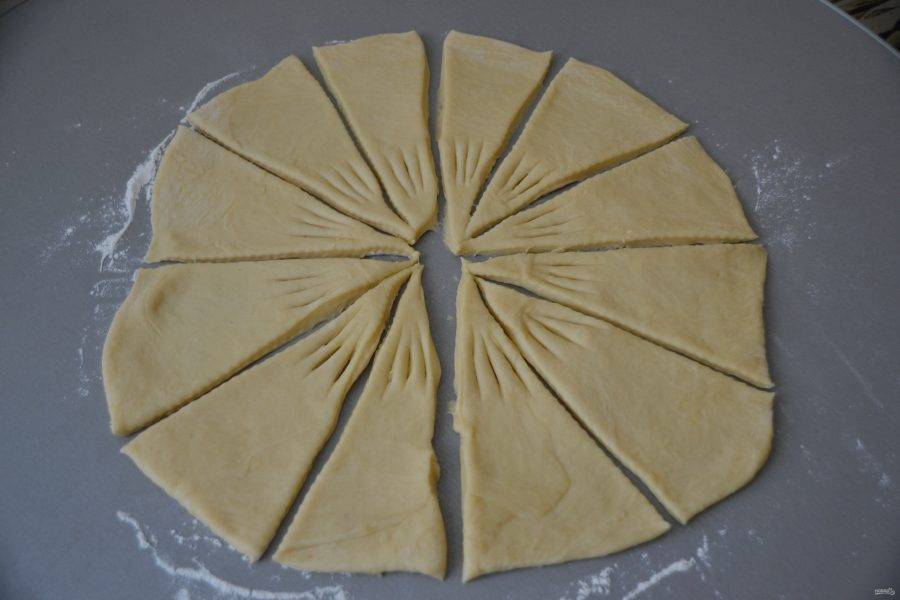 Раскатайте тесто в круг, разделите его на 12 секторов, сделайте прорези на конце каждого треугольника-сектора.
