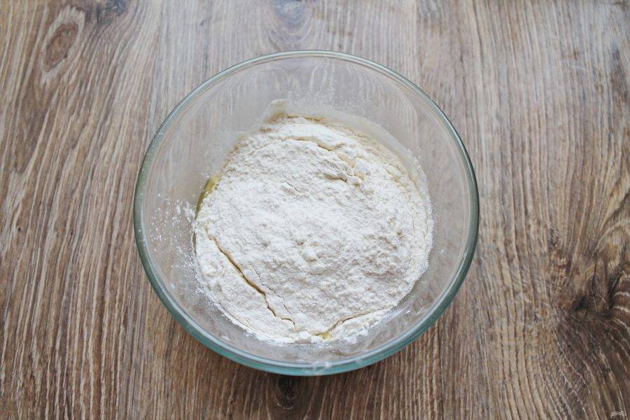 Добавьте в массу просеянную муку с солью и разрыхлителем.
