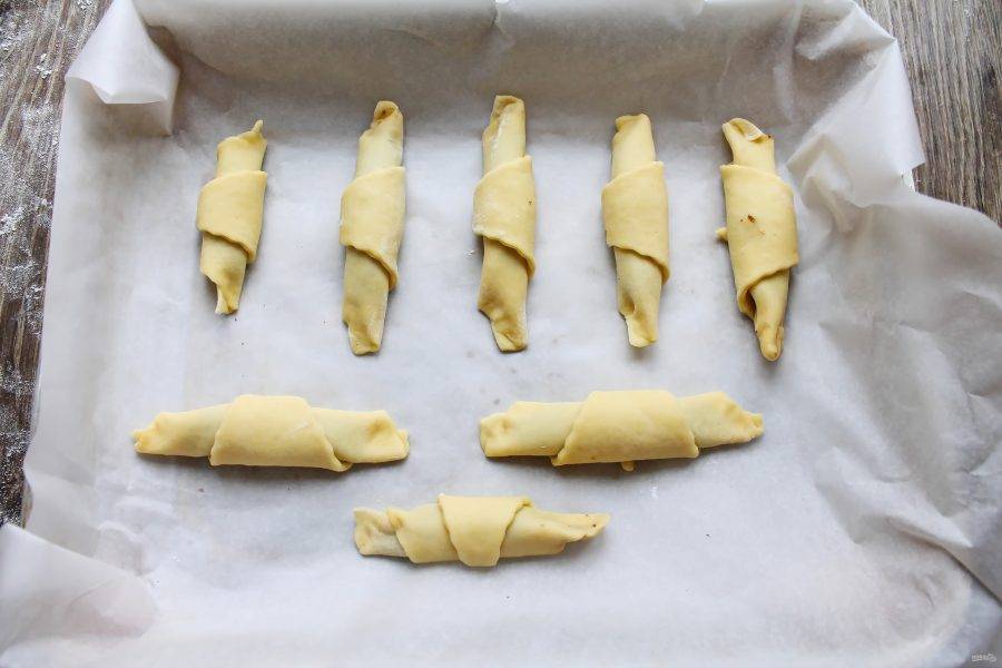Противень застелите бумагой для выпечки и выложите рогалики. Поставьте в теплое место на 20-30 минут для расстойки.