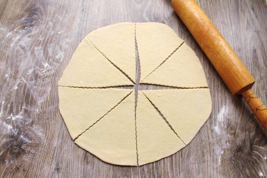 Подошедшее тесто выложите на стол посыпанный мукой и разделите на две части и скатайте в шарики. Накройте и дайте постоять 10 минут. Раскатайте каждый в круг толщиной 0.7 миллиметра и разрежьте на сегменты.