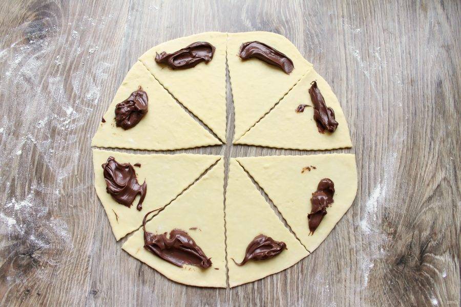 На широкий край треугольников выложите шоколадную пасту. Сверните рогалики от широкого края к узкому. Защипните края, чтобы паста не вытекла.