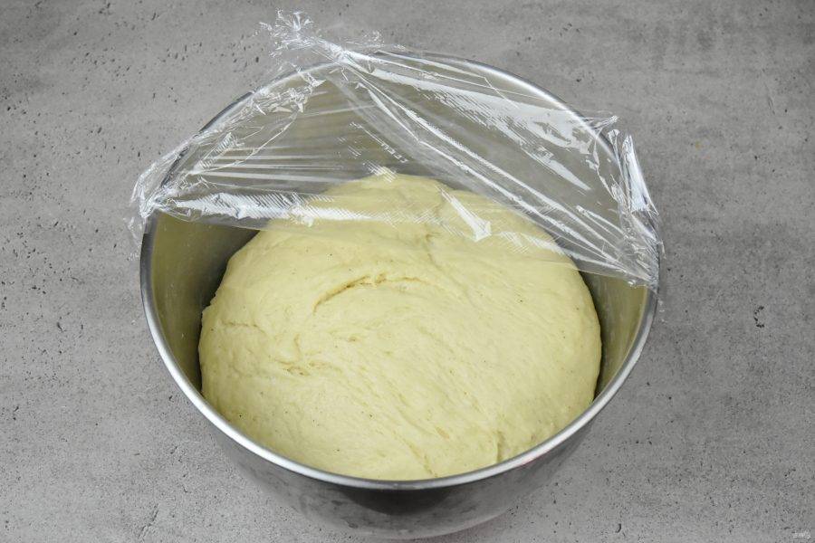 Округлите тесто. Выложите в емкость и накройте полиэтиленовой пленкой. Оставьте при комнатной температуре для подъема минут на 45-60.
