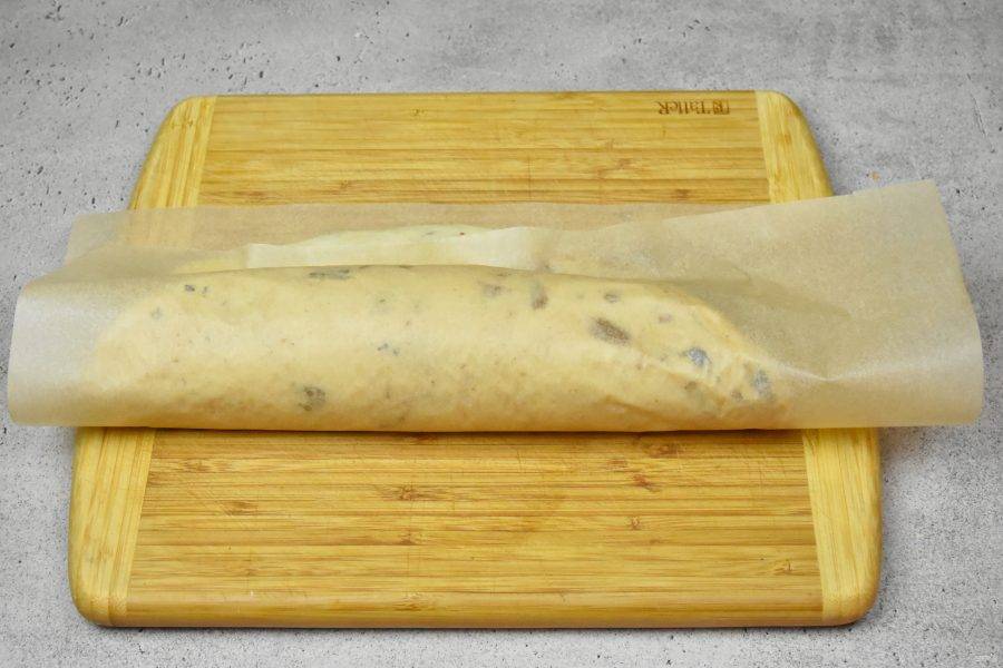 С помощью пергамента крайнюю третью часть теста с марципановой начинкой у основания подверните и уложите на две части из трех. Третью часть теста оставьте свободной.